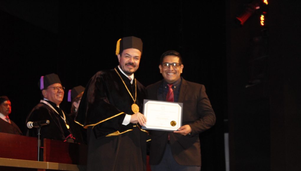El docente e investigador universitario recibió el galardón de manos del C. P. Guillermo Mendoza Cavazos, rector de la UAT, durante la Ceremonia de Entrega de Reconocimiento al Mérito Universitario llevada a cabo en el Aula Magna Herman H. Fleishman del Centro Universitario Sur.
