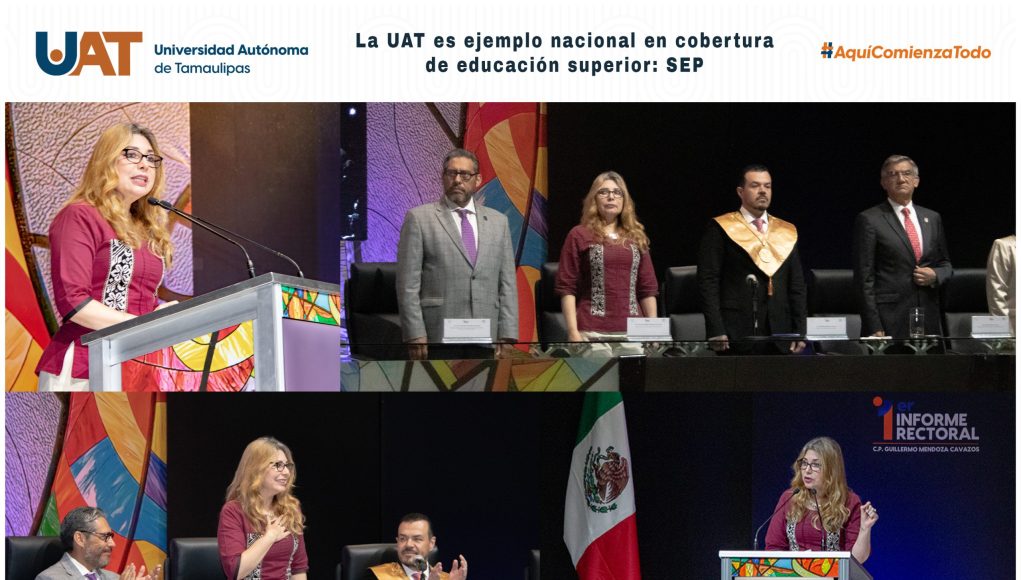 Al asistir como representante de la Secretaría de Educación Pública (SEP) al primer informe del rector Guillermo Mendoza Cavazos, la directora general de Educación Superior Universitaria e Intercultural (DGESUI), Dra. Carmen Enedina Rodríguez Armenta, afirmó que la Universidad Autónoma de Tamaulipas (UAT) es ejemplo nacional en materia de cobertura de educación superior.