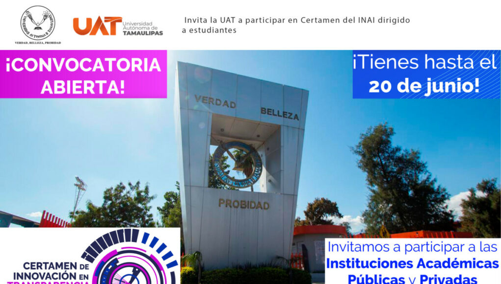 La Universidad Autónoma de Tamaulipas (UAT) hace extensiva a su comunidad la convocatoria del Certamen de Innovación en Transparencia 2024, organizado por el Instituto Nacional de Transparencia, Acceso a la Información y Protección de Datos Personales, el INAI.