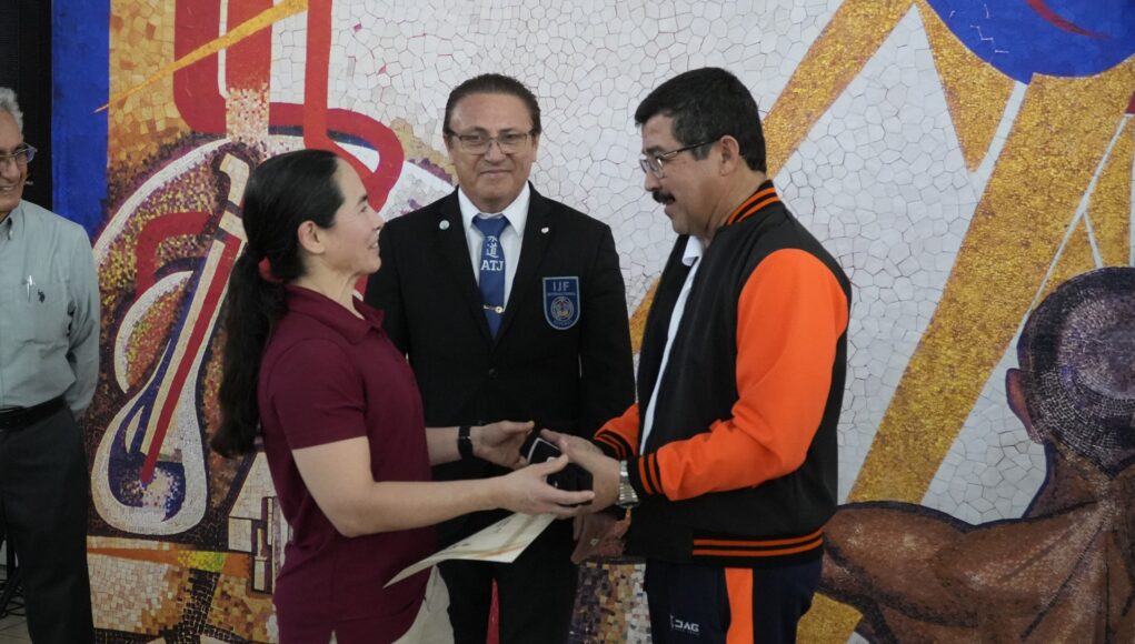 La entrega de esta distinción estuvo a cargo del Shihan Juan Gerardo Guerrero Ortiz, director de Grados y de Kata de la Federación Mexicana de Judo, en el marco de la eliminatoria de judo en su etapa “Estatal CONADE 2026” desarrollada en el Gimnasio Universitario del Campus Victoria, con la presencia de la secretaria de Bienestar Social de Tamaulipas, Silvia Casas González.